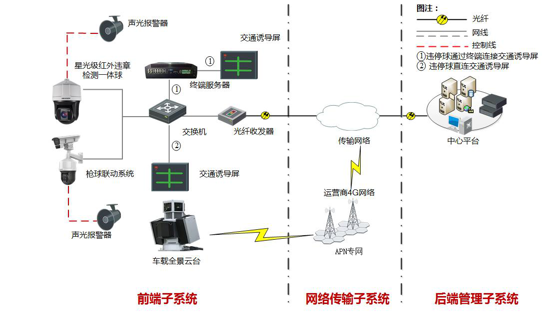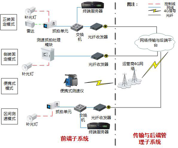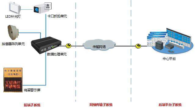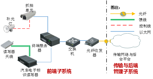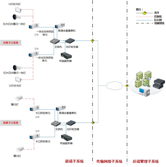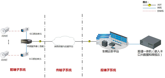 道路车辆智能监测记录系统由卡口前端子系统、网络传输子系统和后端管理子系统组成。实现对通行车辆信息的采集、传输、处理、分析与集中管理。
