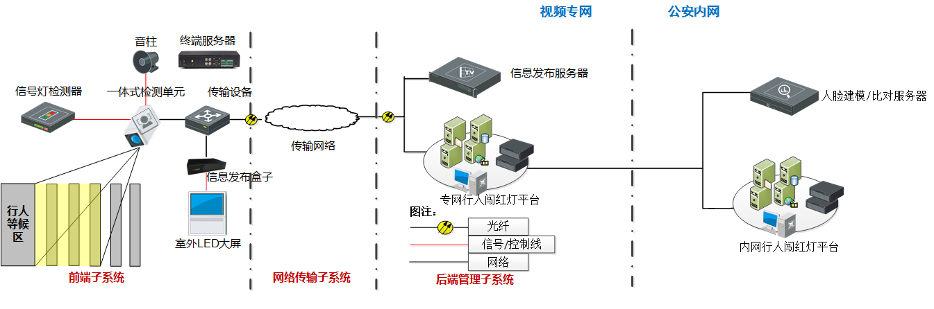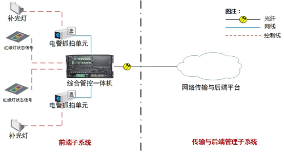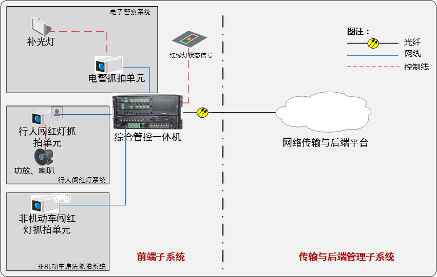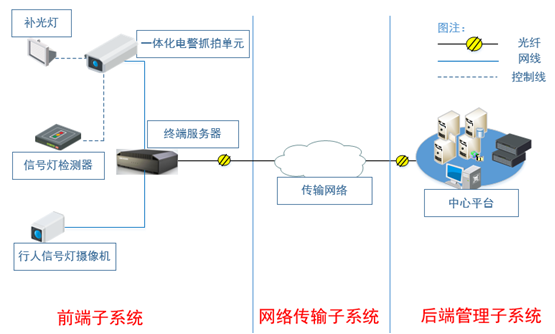 闯红灯自动记录系统由前端子系统、传输与后端管理子系统两部分组成,实现对路口机动车闯红灯、逆行、压线、不按所需行进方向驶入导向车道、不按规定车道行驶等交通违法行为的自动抓拍、记录、传输和处理,同时系统还兼具卡口功能,能够实时记录通行车辆信息。