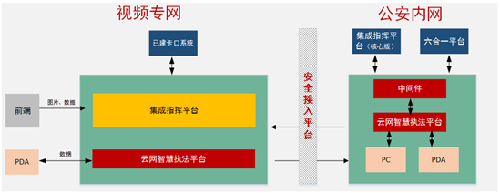 在公安内网进行“云网智慧执法平台”的部署,该平台完成与公安内网“交通集成指挥平台、“六合一”平台的对接,负责对布控预警信息的接收并下发到移动警务终端,同时完成对现场处理业务结果的上传反馈。