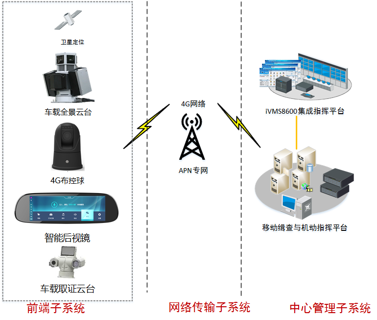 系统包含移动前端设备,主要包含智能后视镜、车载全景云台、4G布控球,不同的移动端设备对应的使用场景不同。