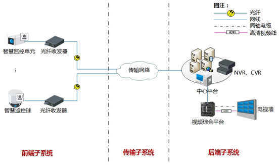 典型的电视监控系统主要由前端监视设备、传输设备、后端控制显示设备这三大部分组成,其中后端设备可进一步分为中心控制设备和分控制设备。前、后端设备有多种构成方式,它们之间的联系(也可称作传输系统)可通过电缆、光纤或微波等多种方式来实现。