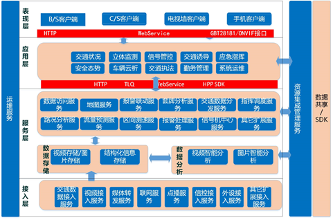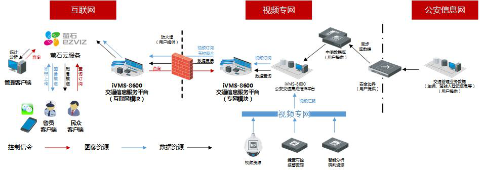 互联网交通信息服务平台,分别在互联网、视频专网部署管理和应用模块,并通过整合视频专网、公安信息网的可视化、数据资源,依托于微信客户端公众号,实现交通信息服务,包括警用指挥调度信息推送、业务数据查询检索、民用实时路况发布等。