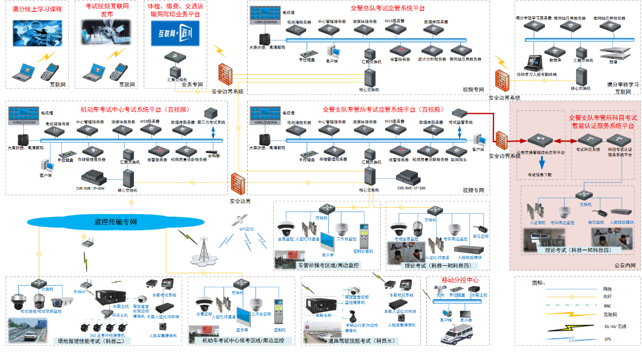 系统方案遵从行政管理体系和行业标准建设规范来设计,在纵向层面的音视频监管遵循传统总队-支队-大队的三层监管;横向层面,按照车管所-机动车驾驶人考试中心二层监管体制部署,监管业务核心以人脸识别技术为核心,按照“三网四平台”格局进行规划建设,在视频专网部署分别部署考试系统和考试监管系统的音视频系统平台以及总队的音视频监管系统平台;在公安内网部署科目一、四的驾驶人科目考试智能认证服务系统平台;在互联网领域部署的违法记分满分教育和审验教育工作的“现场学习+互联网学习”人脸考勤记录系统平台,提供人脸考勤核心设备。