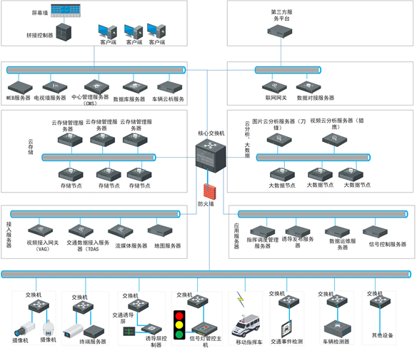 负责实现对辖区内相关数据的汇聚、处理、存储、应用、管理与共享,由中心管理平台和存储系统组成。中心管理平台由搭载平台软件模块的服务器组成,包括:管理服务器、应用服务器、Web服务器、图片服务器和数据库服务器等。